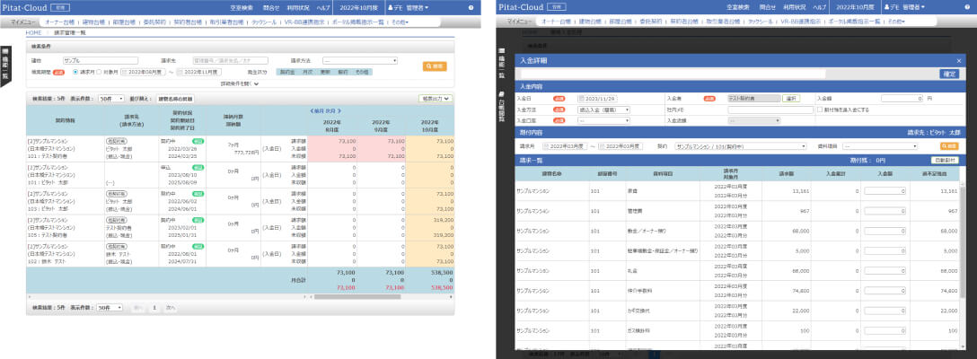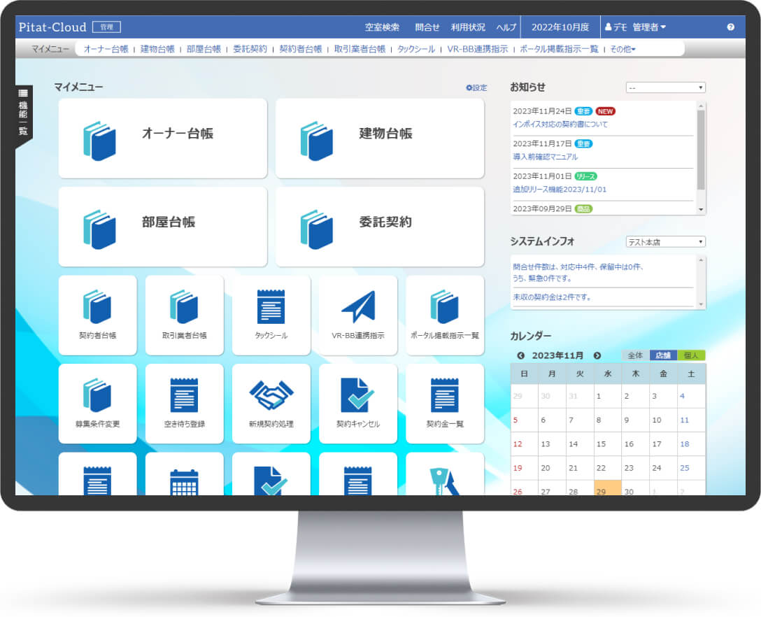 ピタットクラウド管理システムは、入居者の契約更新、請求、建物維持業務の各種管理機能までを網羅した管理業務特化システムです。